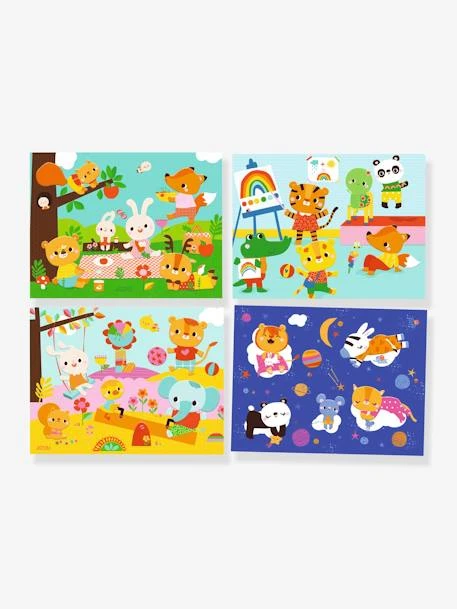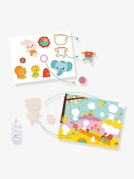Une première activité de collage pour les tout-petits, dès 18 mois. Des formes épaisses faciles à détacher, à coller sur les jolies illustrations, pour réaliser 4 tableaux.