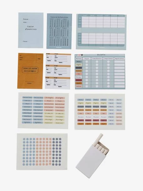 - Papeterie : cahier d’exercices avec tables de multiplications au dos, carnet de liaison, bulletin, emploi du temps. 3 planches de stickers avec pastilles colorées, matières et appréciations pour remplir l’emploi du temps et le bulletin